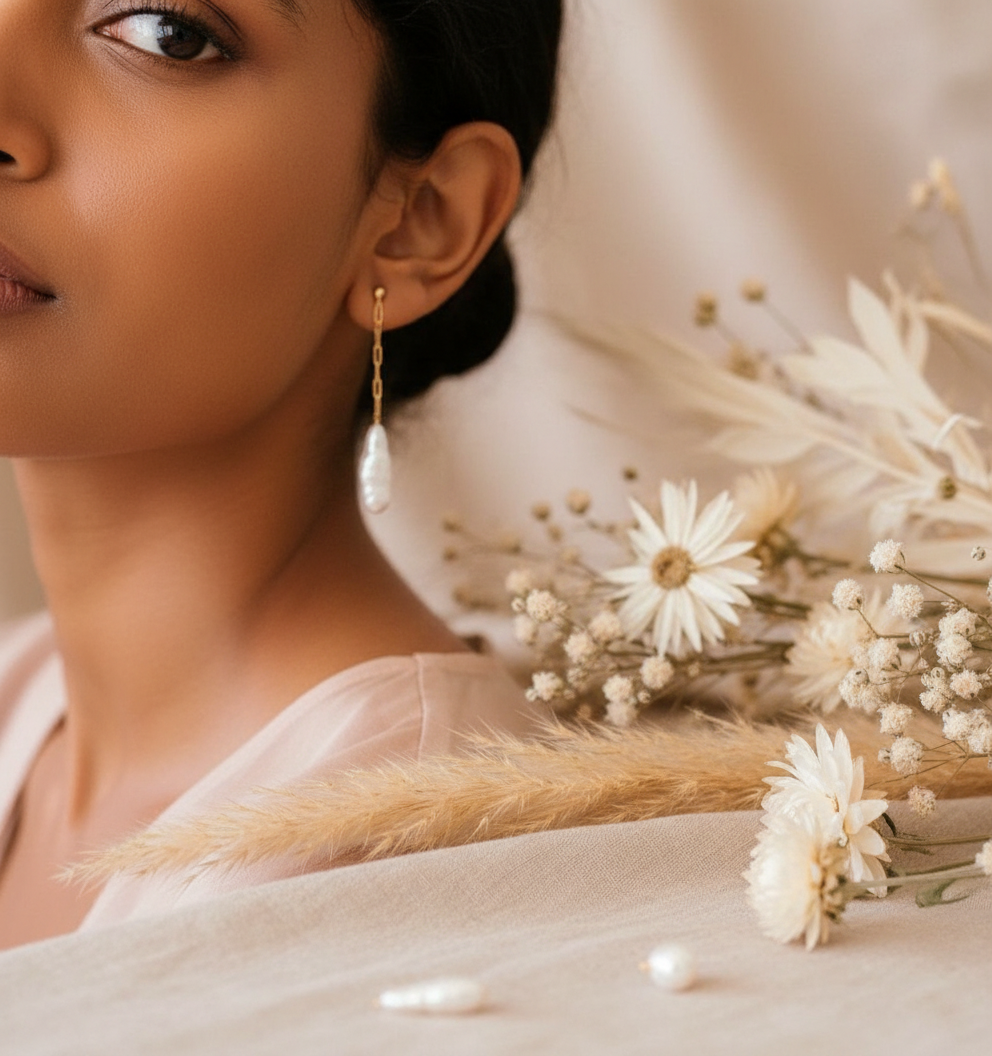 El broquel y la cadena están fabricados en baño de Oro de 18k sobre Rodio y la Perla es Barroca Biwa (un tipo de Perla muy especial alargada y con una forma natural bellísima)