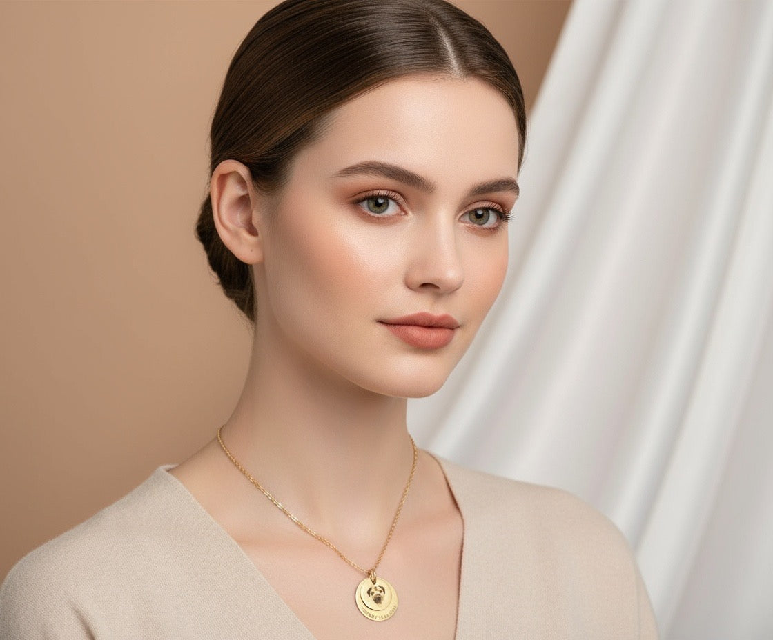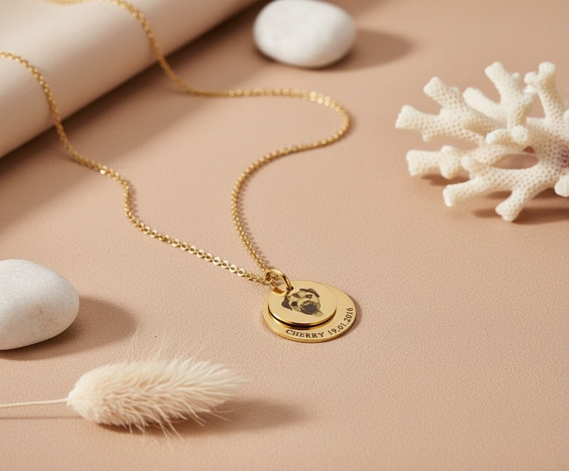 ¿Te imaginas poder llevar a tu mascota siempre contigo de una manera elegante? ¡Con nuestro collar 2 Monedas Mascota es posible! Envía la foto de tu compañero por WhatsApp y elige qué grabar en la moneda posterior. ¡Haz que tu mascota esté siempre presente en tu día a día!