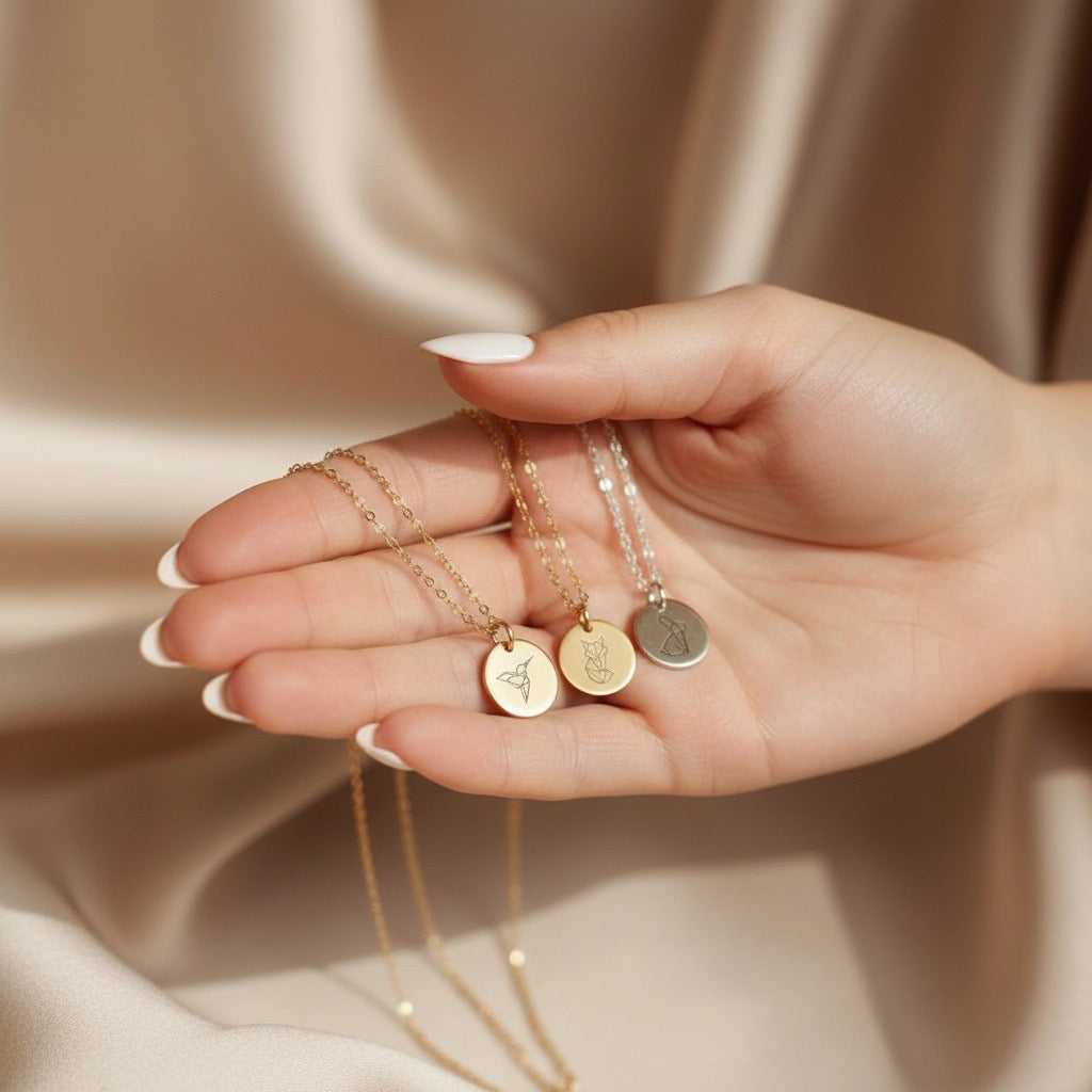 Moneda de 12 mm de diámetro con cadena de 45 cm de largo.