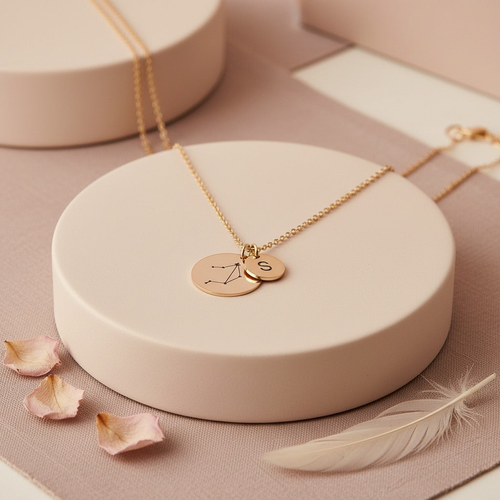 Collar elaborado con cadena de acero inoxidable de 45 cm de largo, monedita grabada en láser con la constelación de tu signo zodiacal y monedita grabada en láser con tu inicial.