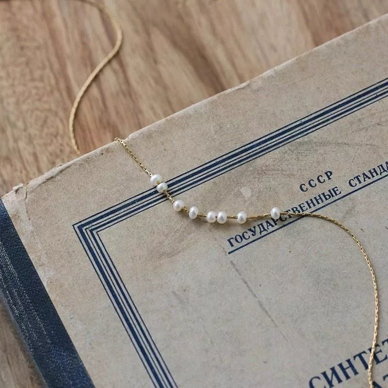 Fabricado con preciosas perlas pequeñitas cultivadas de agua dulce y una fina cadena de baño de oro sobre Rodio de 18k llamada "cardano"
