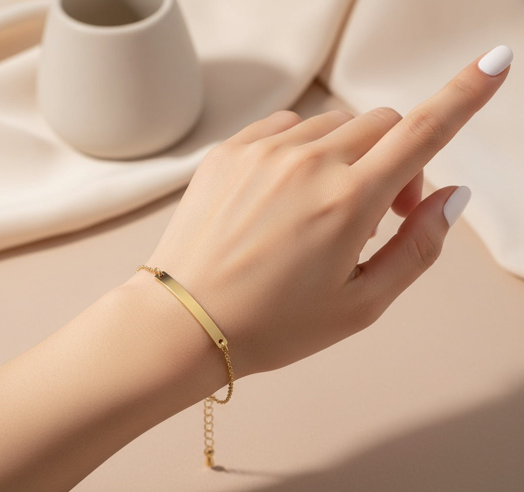 Pequeña plaquita de 39mm por 5mm de acero inoxidable a 16.5cm más 3cm de extensible en el cual puedes grabar aquella fecha, nombre o coordenada importante para ti que podrás tener siempre cerca de ti.