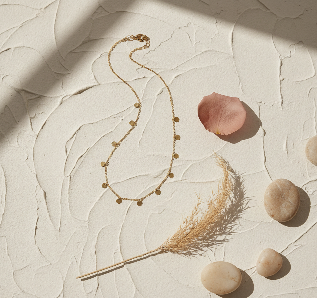 Cadena de acero inoxidable de 42 cm de largo con o sin extensible y moneditas bañadas en oro de 18k.