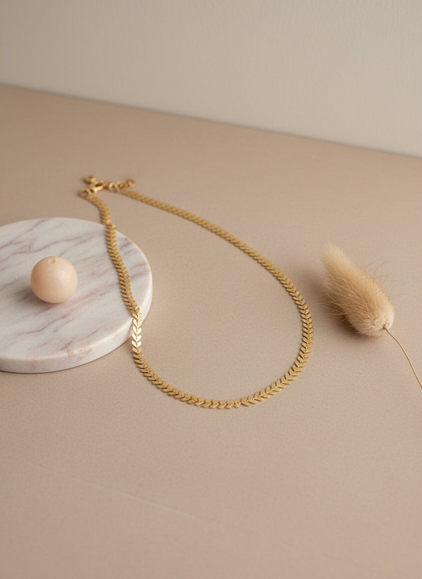 Descubre la belleza del campo en un collar elegante y sofisticado. Nuestro collar de espigas doradas en acero inoxidable es perfecto para agregar un toque de estilo y distinción a cualquier outfit.
