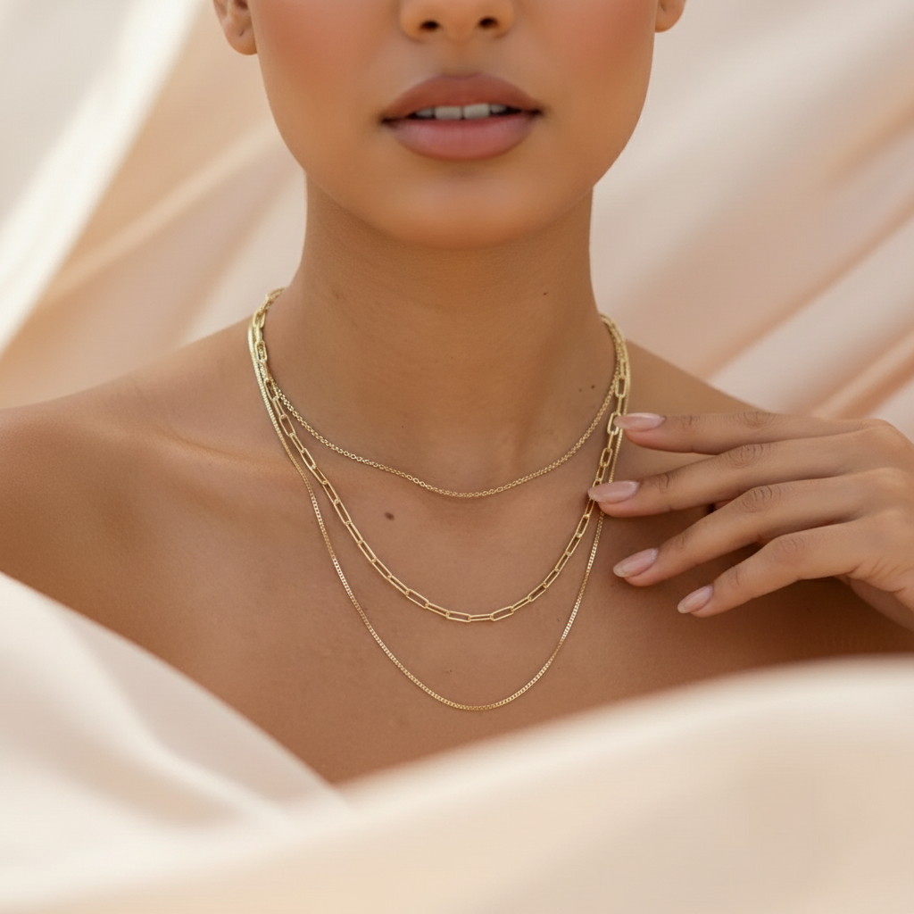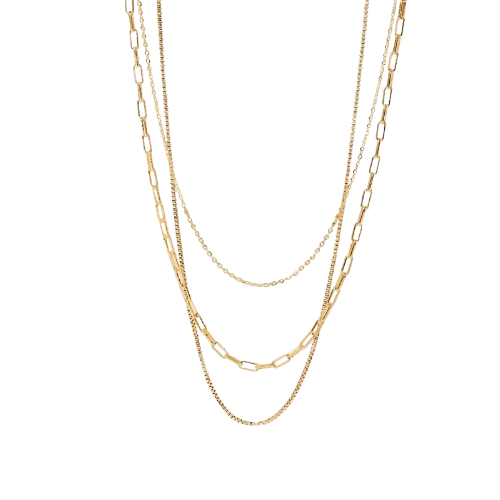 El collar más corto mide 38cm, el de en medio 42cm y el último 47cm, incluye extensión para que lo ajustes a tu medida