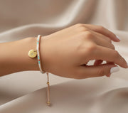 Esta pulsera esta inspirada en dicho arte, tejida artesanalmente a mano con cristal japonés miyuki, acompañada de una monedita de acero inoxidable  grabada con tu Inicial de 10mm de diametro.